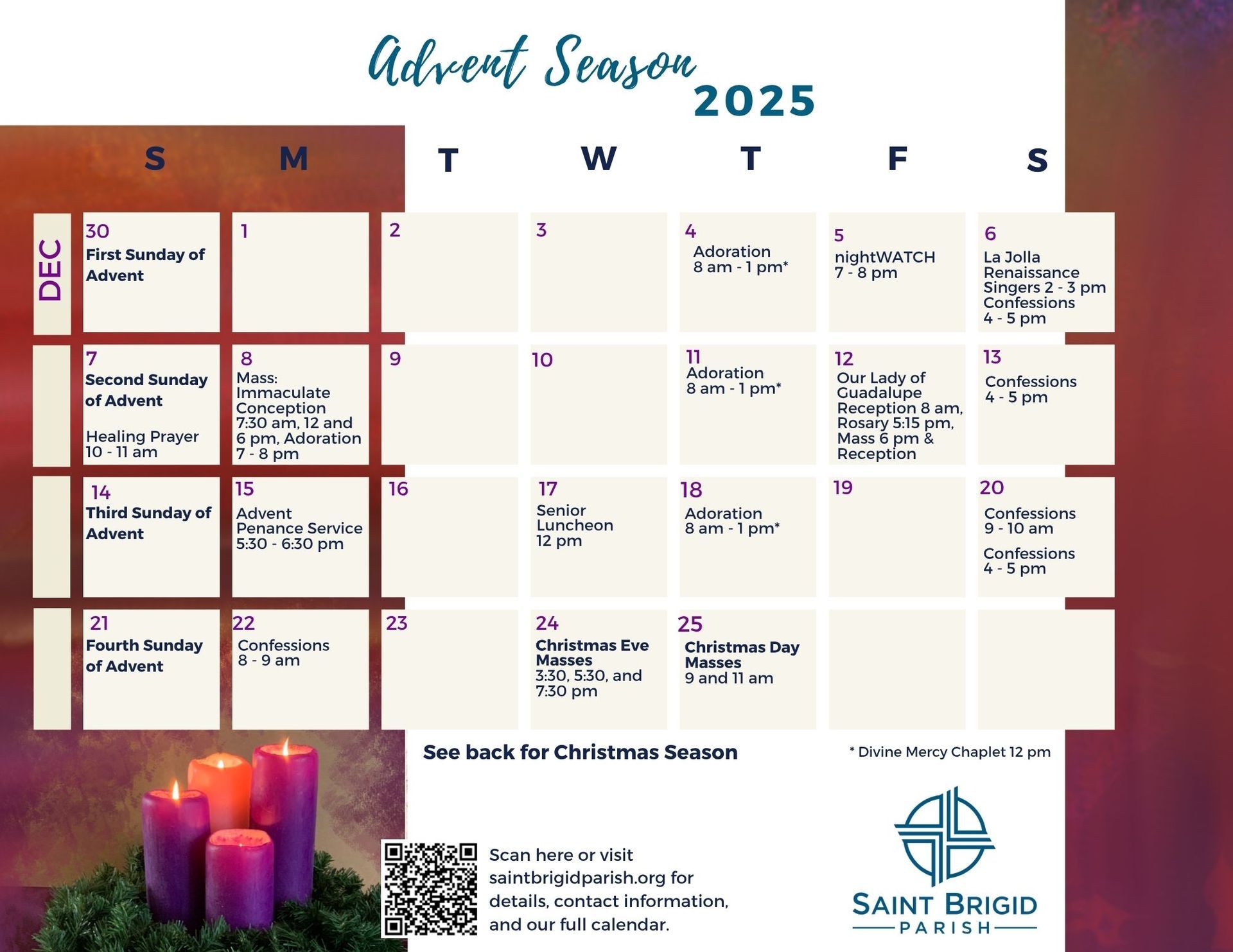 See what's happening at St. B's by picking up a hard copy of our Advent Calendar at all the Church exits, click the image below, or explore our parish calendar for a full calendar of events