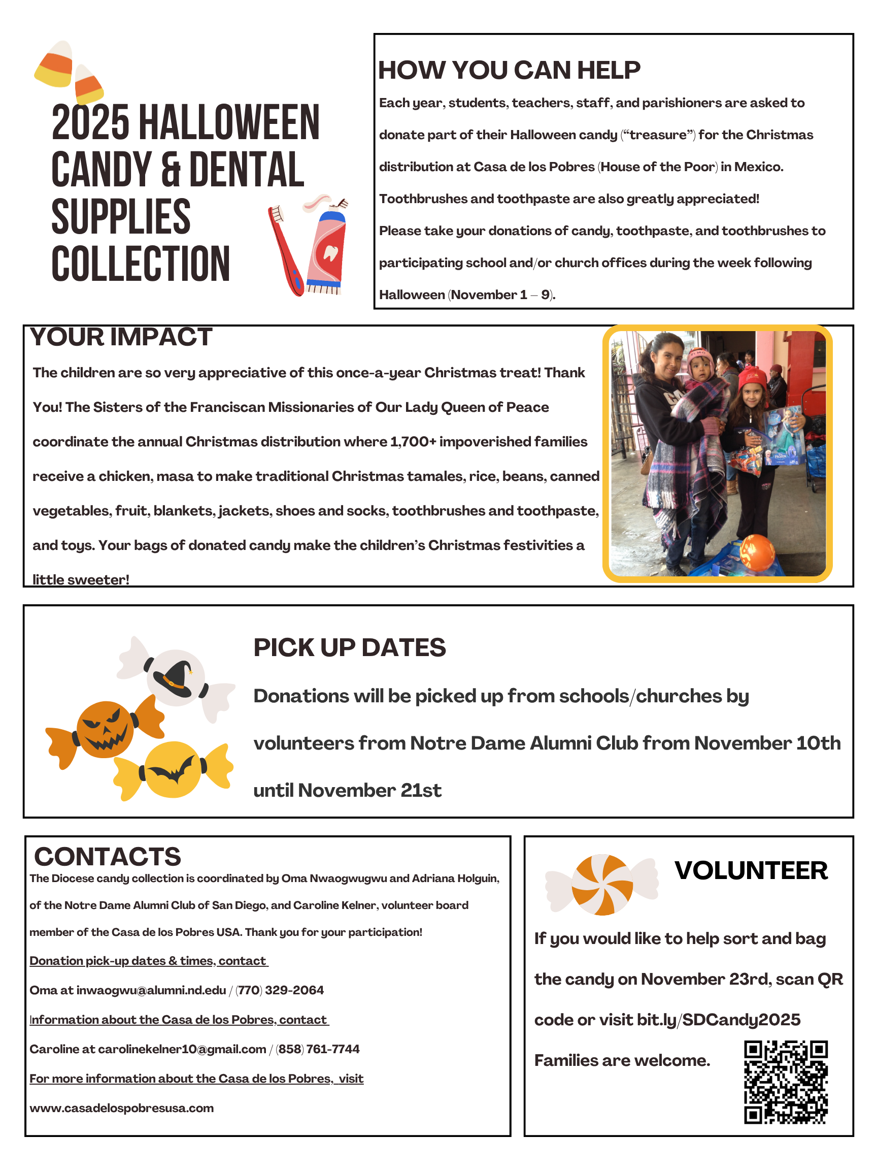 Donate your leftover Halloween candy for the Christmas distribution at Casa de los Pobres in Mexico. Also sort and bag the candy on November 23 - families are welcome.