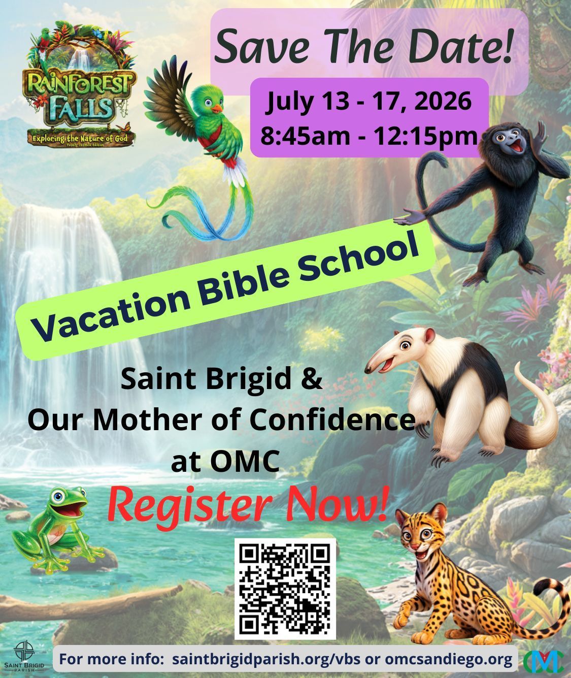 Join us this year as we partner with Our Mother of Confidence (OMC) Parish to co-host a fun week of adventure exploring the nature of God at Rainforest Falls VBS! While our VBS will take place at the